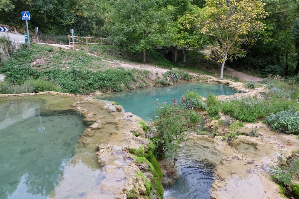 Nous quittons la ville en longeant un lac formé par un barrage sur le fleuve. L’eau tantôt verte tantôt bleu turquoise vient se mélanger avec l’eau ocre du fleuve dans un mélange de teintes marbrées. Cela fait suite aux nombreuses précipitations tombées sur les Picos durant ces derniers jours rappelant que l’automne est là. Puis nous prenons vers Burgos sur la N263 mais bifurquons rapidement pour visiter un village qu’on nous a recommandé dans celle vallée de l’Ebre : Orbaneja del Castillo. C’est un charmant village perché, traversé par une rivière qui nait d’une grotte en plein milieu du village et s’en échappe par une série de cascades cristallines pour finir en piscines naturelles turquoise qui invite à la baignade. La saison est fraiche et nous abandonnons l’idée de trempette, mais plutôt d’en arpenter les ruelles escarpées de ce village labellisé « plus beau village d’Espagne ».